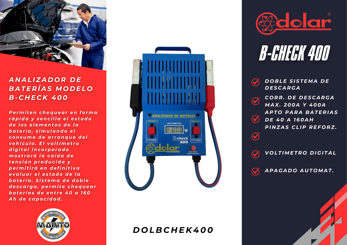 PERMITE CHEQUEAR DE FORMA RAPIDA Y SENCILLA EL ESTADO DE LOS ELEMENTOS DE LAS BATERIAS, SIMULANDO EL CONSUMO DE ARRANQUE DEL VEHÍCULO. EL VELOCIMETRO INCORPORADO MOSTRARA LA CAIDA DE TENSION PRODUCIDO Y PERMITIRA EN DEFINITIVA EVALUAR EL ESTADO DE LA BATERIA.